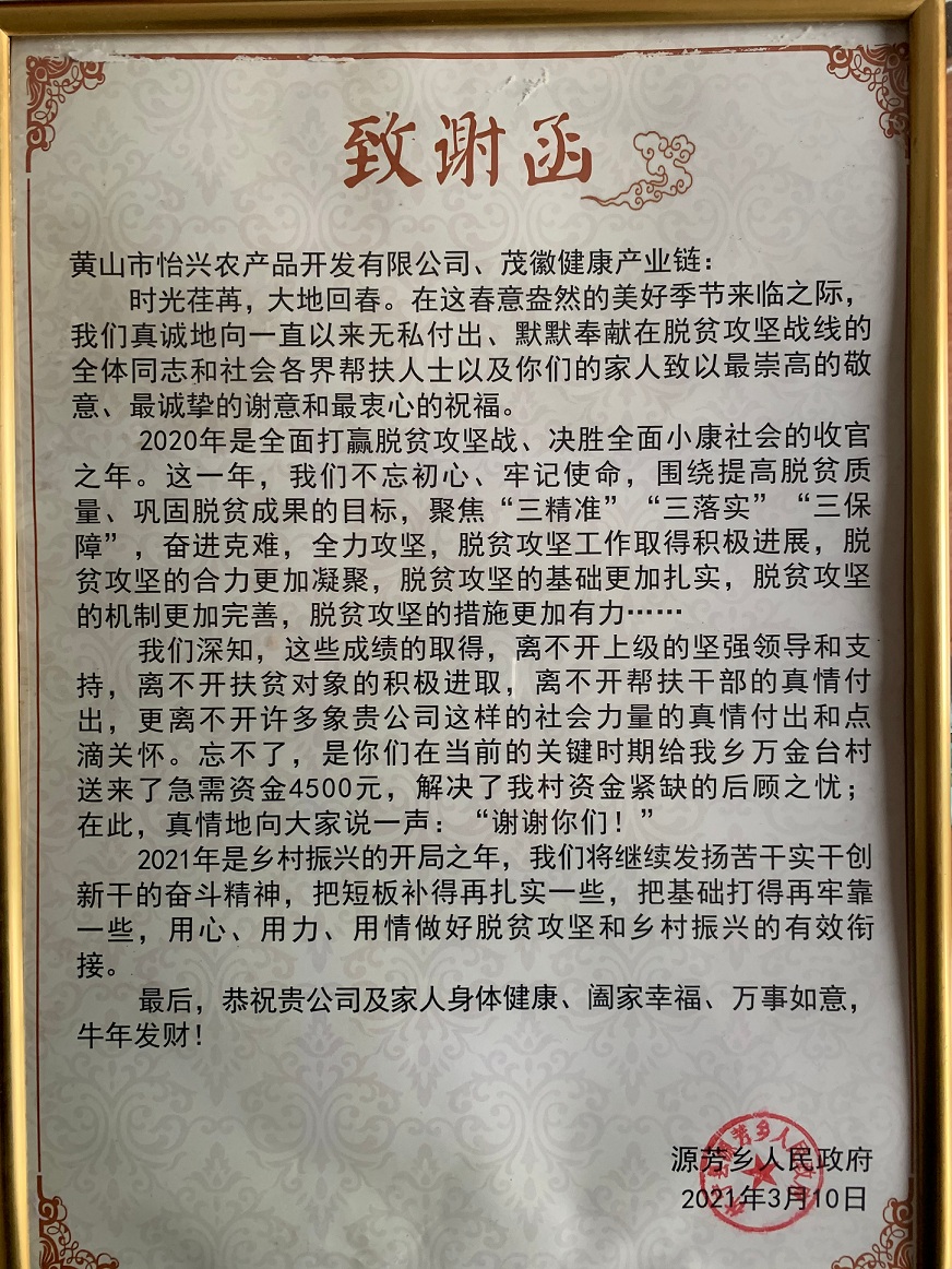 2021年3月15日,黃山市怡興農產品開發(fā)有限公司收到來自源芳鄉(xiāng)人民政府的一封《致謝函》。